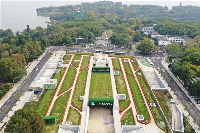 2019年11月6日,武汉东湖风景区梨园广场停车场综合体工程经过3年多的封闭施工,主体工程已完成,目前正在进行绿化施工及地下内部装修。该综合体总建筑面积约3.1万平方米,集地铁换乘、停车、商业、景观广场等多重功能于一体,地下一层为商业和设备用房区间,地下二层、三层为公共停车场,共提供约650个停车位,较原来增加近10倍,极大地改善东湖风景区及东湖绿道附近的停车难题。(湖北日报全媒记者 李溪 摄)