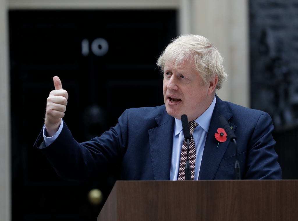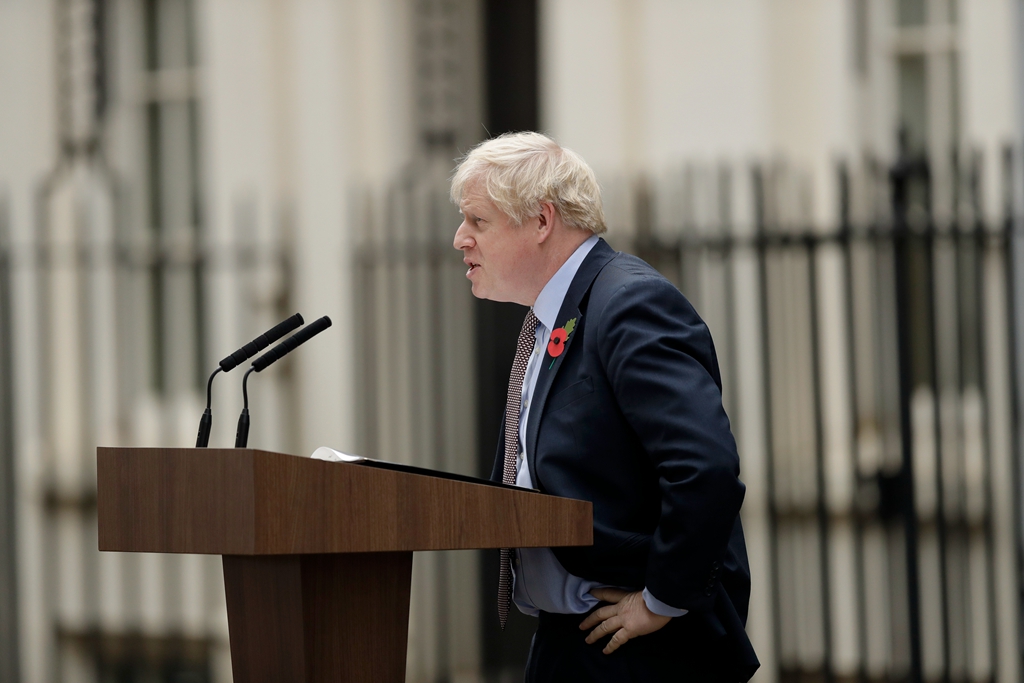 当地时间2019年11月6日,英国伦敦,英国首相鲍里斯-约翰逊在与英国伊丽莎白二世女王会见后,在唐宁街10号首相府外发表讲话。标志着英国议会正式解散,为期五周的竞选活动正式开始。