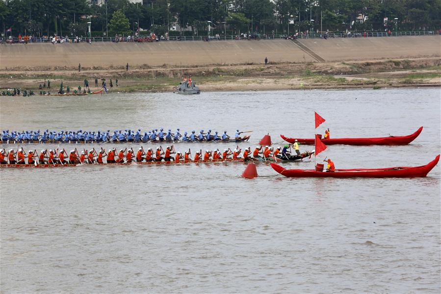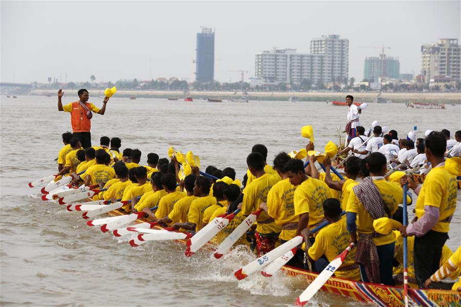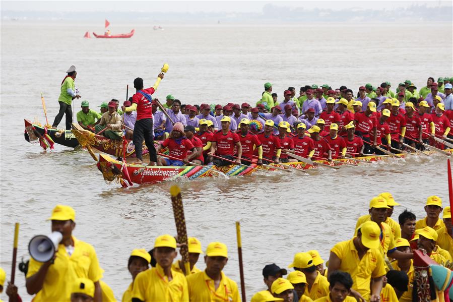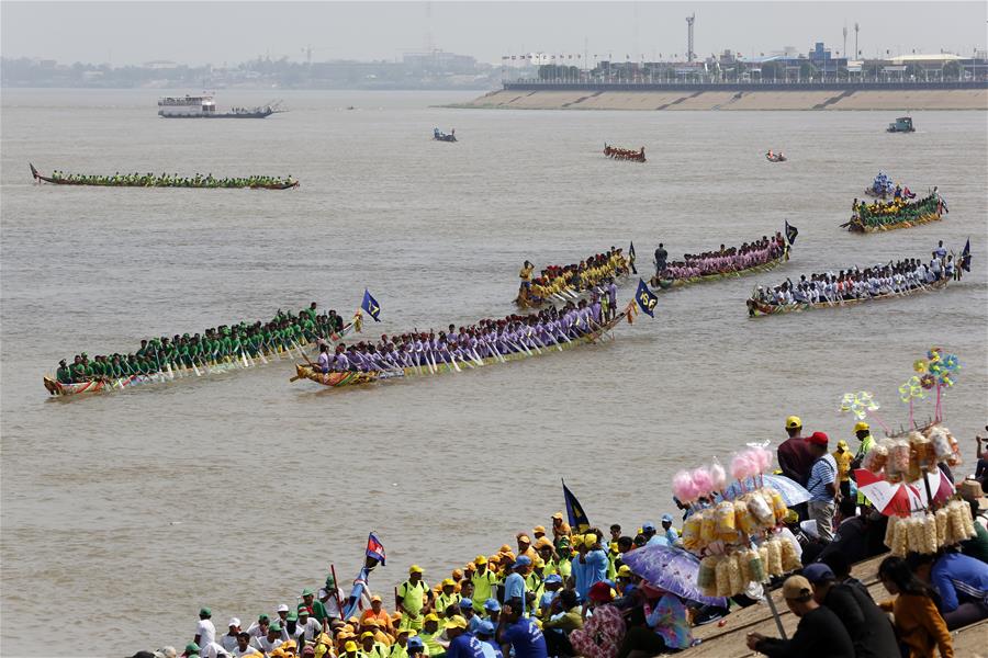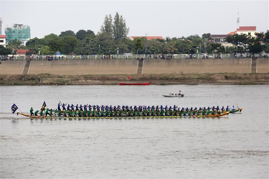 11月10日,在柬埔寨首都金边,人们参加龙舟比赛。 送水节是柬埔寨最重要的传统节日之一,今年的送水节庆祝活动于11月10日至12日举行。 新华社发(索万纳拉 摄)