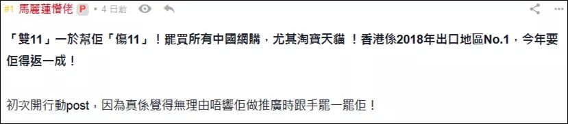 今年“双11”开始前,有香港激进分子在“煽暴”讨论区“连登”发帖,称香港在去年“双十一”商品出口的境外地区中位列第一,今年要抵制所有内地网络购物,尤其是淘宝天猫,让“双十一”变成“伤十一”。