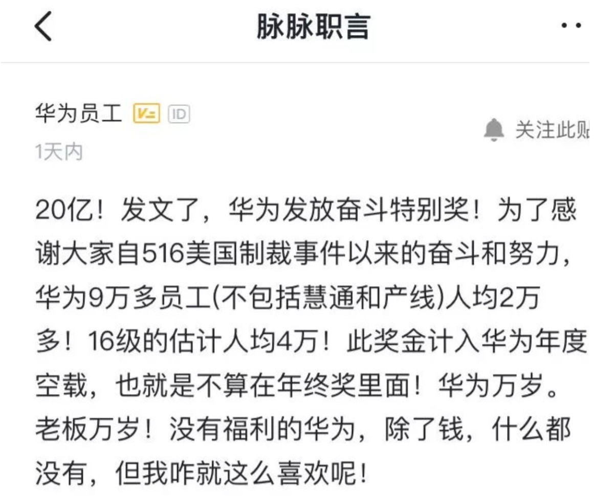 值得注意的是,华为员工均称,此奖金计入华为年度空载,也就是不算在年终奖里面。