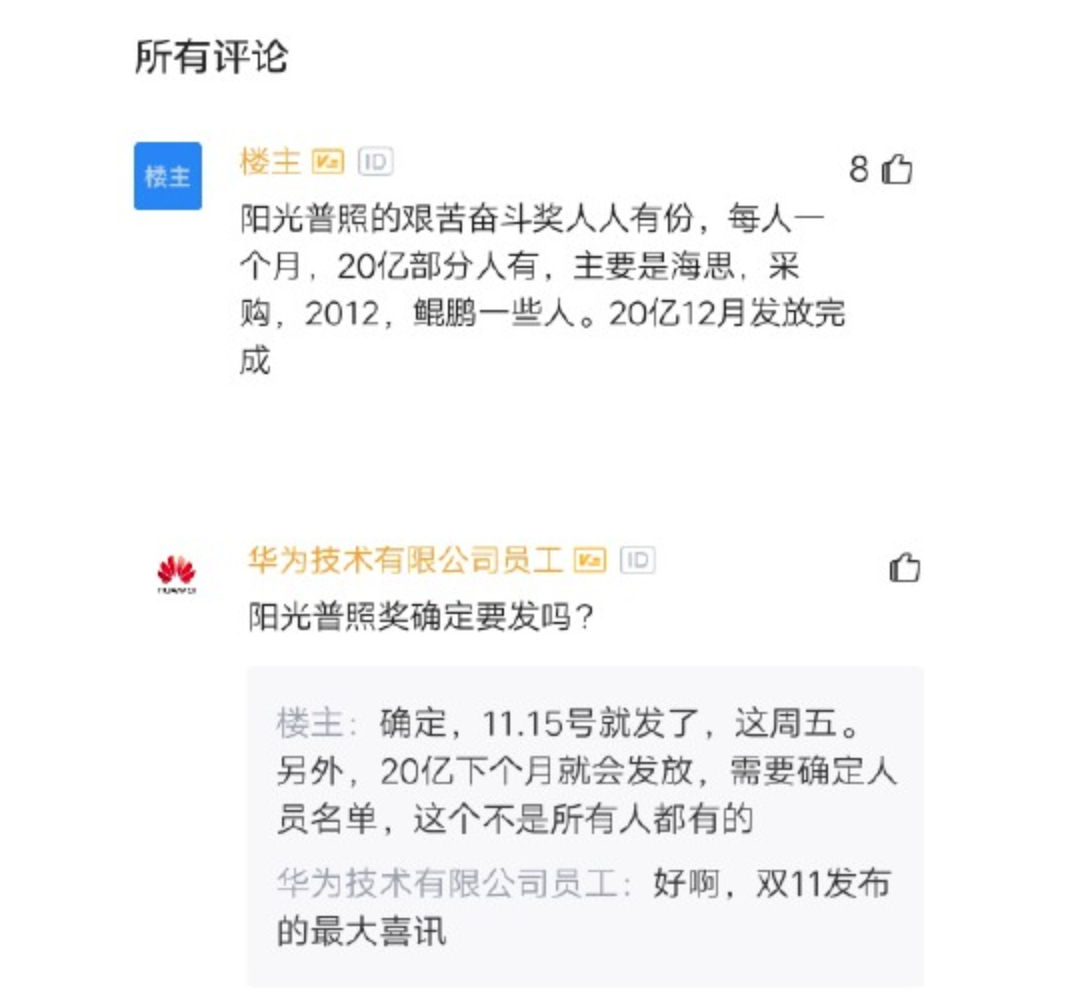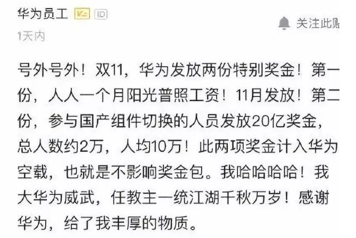 “号外号外!双11,华为发放两份特别奖金!第一份,人人一个月阳光普照工资!11月发放!第二份,参与国产组件切换的人员发放20亿奖金,总人数约为2万,人均10万!”11日晚间,有华为员工爆料称。据悉,该奖是为了感谢员工自华为受到制裁以来的努力和奋斗。