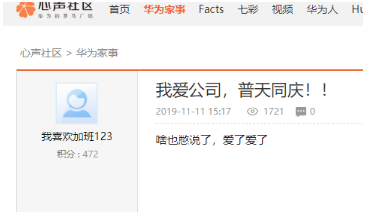 华为发奖的消息一出,一些员工开始在华为的心声社区发帖庆祝,有的表示“我爱公司,普天同庆”: