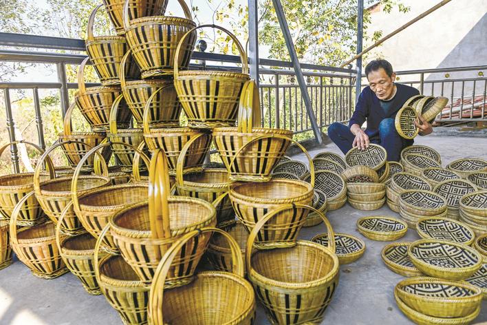 每逢周末,或者花朝节等民俗节庆,梅育斌都会到集市上支起一个摊位,编有“福”“喜”等字样花纹的篾器,总能吸引不少人围观。两百,三百,甚至五百,一群买家围着精美的篾器互相竞价。梅育斌很是开心,如今还有不少武汉市区和外地的顾客,专门找他定制。下一步,他还想为自己传承的手艺,申请一个非遗项目,让更多的人加入进来,希望带动村民致富。