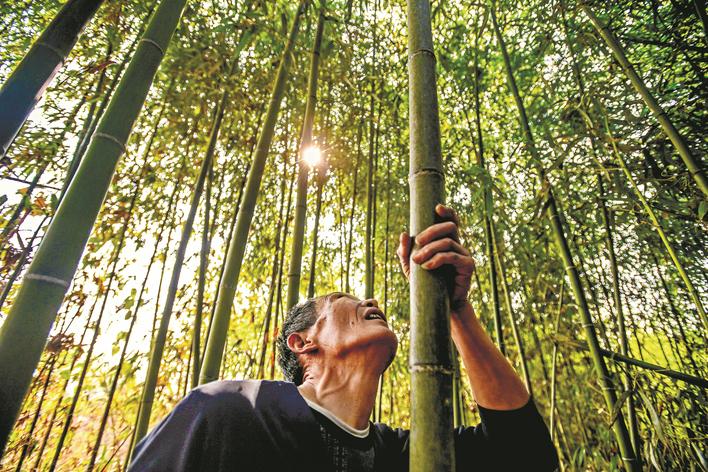 砍竹子,犹如击鼓。竹园里,梅育斌摇竹杆选材,长竹笋的母竹子根部紧实,材质柔韧宜做编织,公竹子则根部松散,材质坚挺宜做支架。选定竹子后,梅育斌从腰间取下砍刀,“砰砰……”竹子应声倒下。