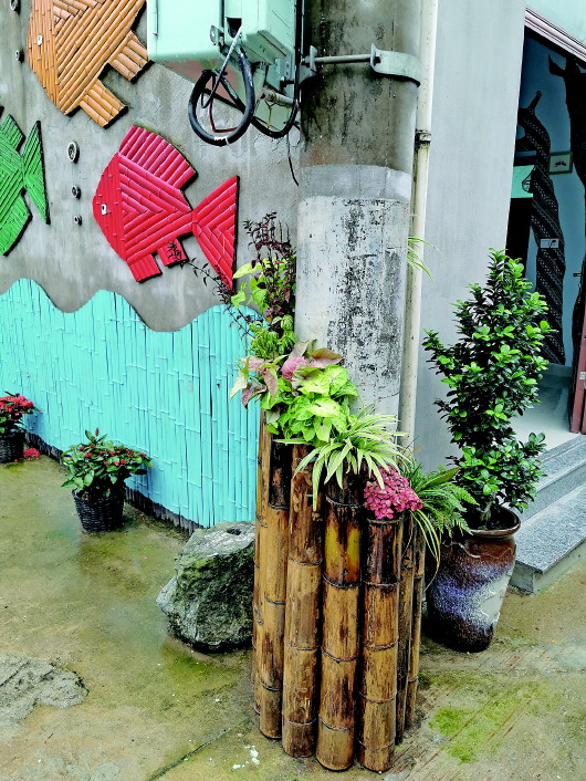 村内有一条约两百米长的巷子,环境脏乱。丛志强叫上村民,就地取材,把溪坑里的石头、山上的毛竹、废弃的瓦片等,设计加工成了躺椅、树桩、围墙和风铃……巷子一下子变得漂亮了。