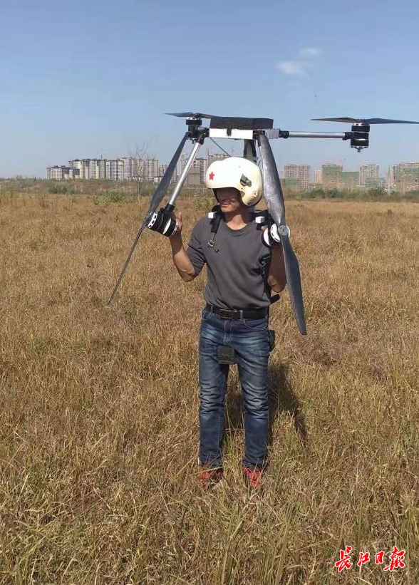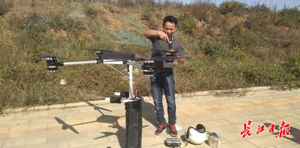 长江网记者获悉,53岁的舒满胜,是武汉市东湖新技术开发区流芳街大舒村农民。他是一位航空迷,曾造出多架载人飞行器。这个四旋翼电动飞行背包是他的最新作品。