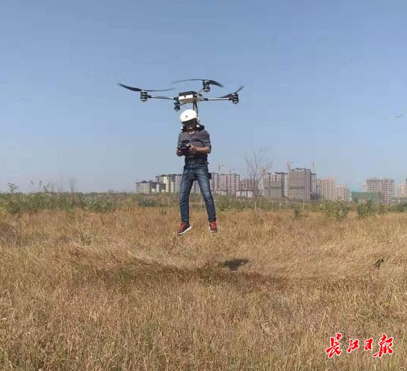 长江网11月14日讯(记者陈奇雄)11月14日中午,在武汉东湖新技术开发区光谷四路与竹林路交会处附近草坪上,武汉男子舒满胜乘坐自己制造的四旋翼电动飞行背包,多次升入空中,并在空中作出了悬停、前飞、后飞与侧飞等动作。