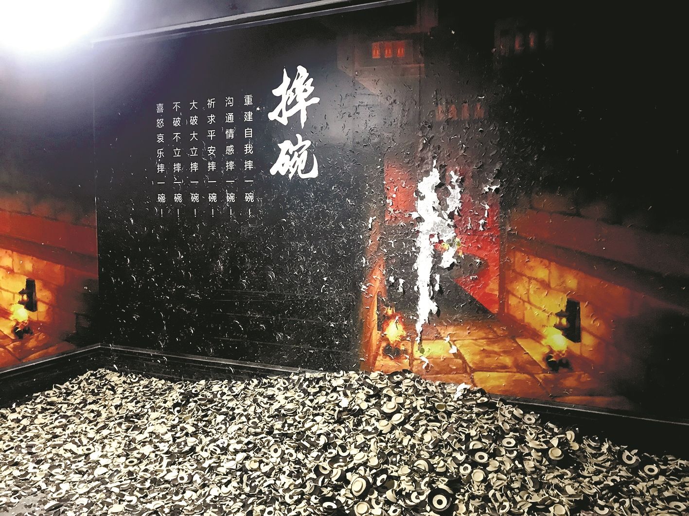 在隔壁房间内,支离破碎的瓷碗已铺满了大半个地面,墙面幕布上也被砸出了许多破洞。破洞之下,“重建自我摔一碗”“喜怒哀乐摔一碗”等解压字句清晰可见。尝试着摔了一碗的女孩小陈,并不太适应这样的减压方式,她说来体验只是因为好奇。
