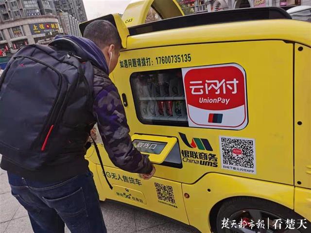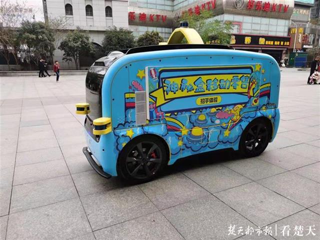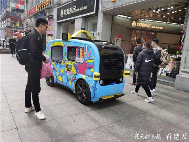 楚天都市报11月18日讯(见习记者詹钘)身披卡通外衣,车头大眼萌,全身从车顶到车前都装满“触角”传感器,一边缓慢移动一边发出声音,有人在车前招手它便停下,供顾客自助选择商品。最近,这种自动无人售货车在江汉路步行街亮相,吸引了不少人的目光。