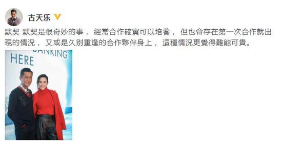 网易娱乐11月19日报道 11月19日,古天乐晒出一张和老友宣萱的照片,并发文谈对默契的感想:“默契是很奇妙的事,经常合作确实可以培养,但也会存在第一次合作就出现的情况,又或是久别重逢的合作伙伴身上,这种情况更觉得难能可贵。 ”