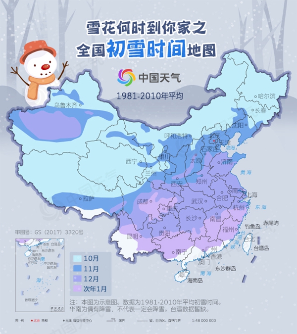 不过,我国地域辽阔,各地下雪时间早晚差别很大,东北、西北的一些地方往往10月中下旬就开始下雪;南方大部的初雪时间集中在12月中下旬;华南地区出现降雪的概率本就不高,即使出现,时间也更晚一些,在次年1月中下旬才会迎来初雪。而在云南的一些地方,个别年的2-3月份也会飘下雪花。