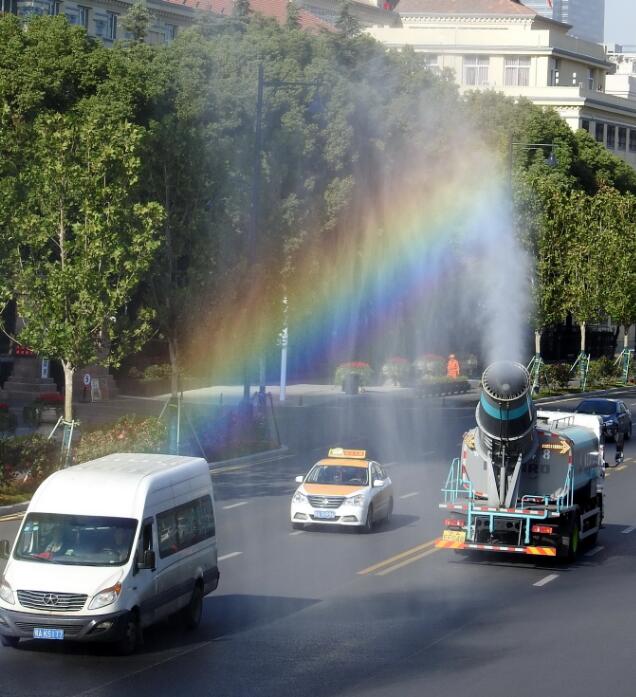 长江网11月22日讯(i记者李长林)11月19日,在武汉市汉口沿江大道,一辆多功能环卫保洁车,正在江岸辖区进行喷雾降尘作业,喷出的雾水,在初冬的温暖阳光照耀下,形成了流动的彩虹,美不胜收,成为江城一道最美最靓丽的风景。
