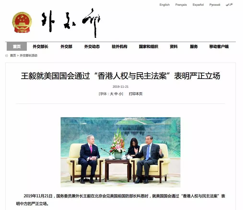 2019年11月21日,国务委员兼外长王毅在北京会见美国前国防部长科恩时,就美国国会通过“人权与民主法案”表明中方的严正立场。