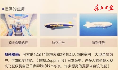 推介现场,德国湖北社团联合会执行会长朱飞介绍了德国老牌公司齐柏林(Zeppelin)的飞艇项目。长江网记者通过PPT展示了解到,飞艇由硬骨架撑起,表面蒙皮结构,内部多个气囊装氢气,依靠发动机推动前行。