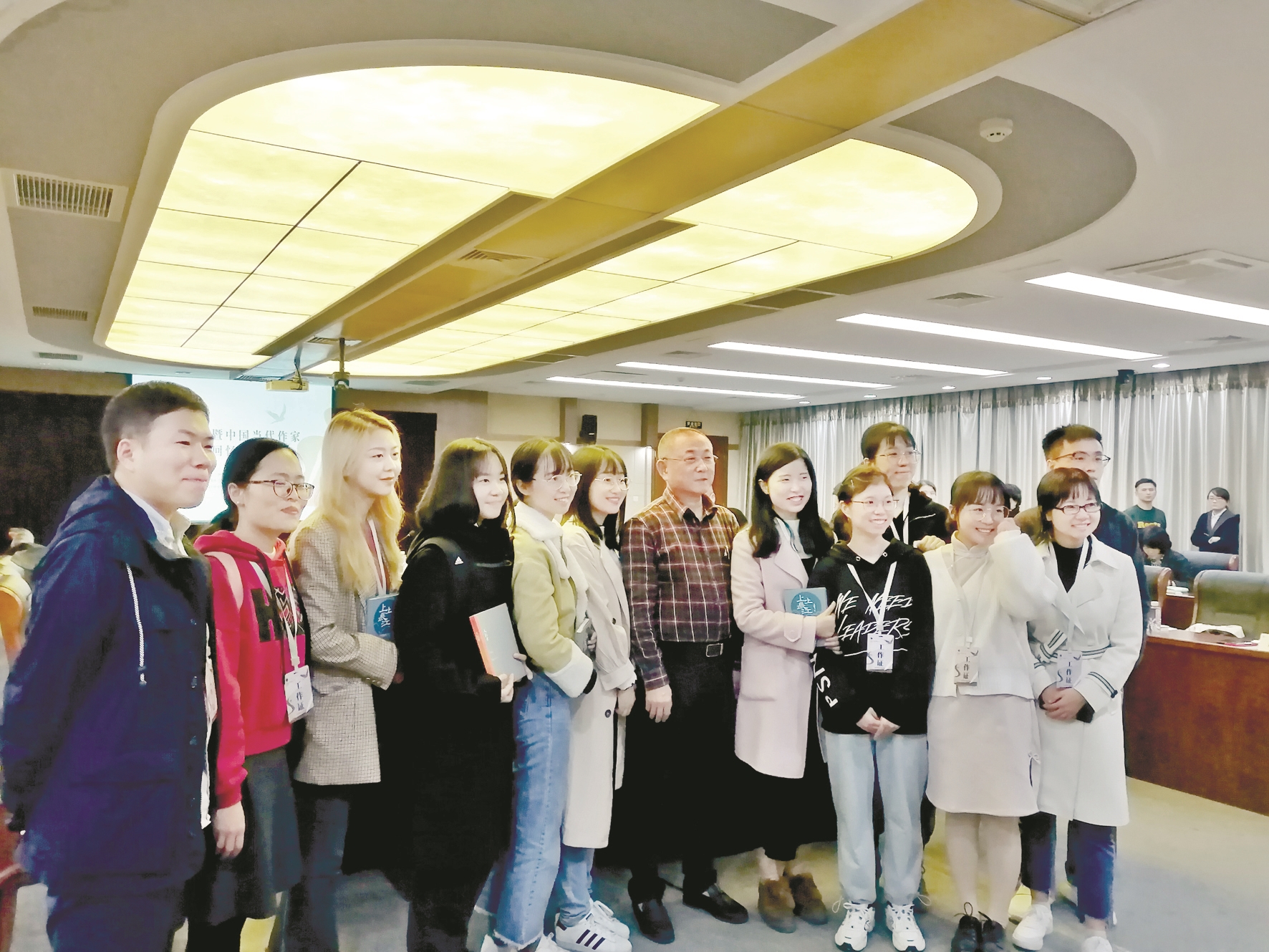 “刘醒龙暨中国当代作家文学回忆录研讨会”上,刘醒龙与华师学生合影