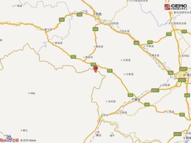 11月25日9时18分在广西百色市靖西市发生5.2级地震,震源深度10千米,震中位于北纬22.89度,东经106.65度。