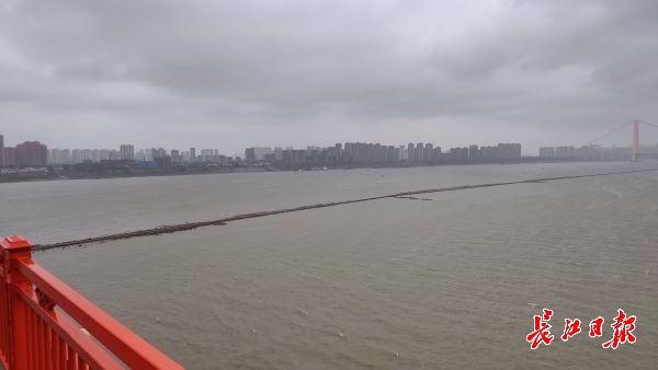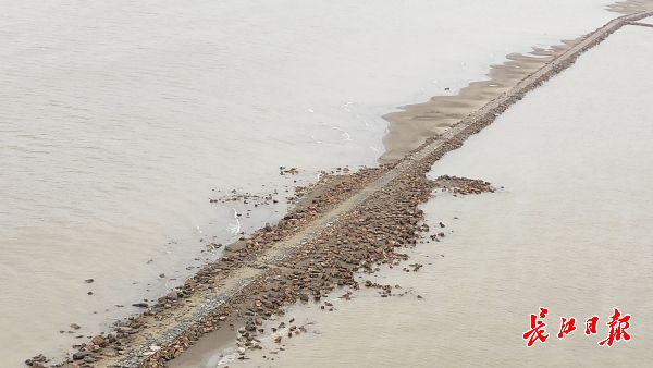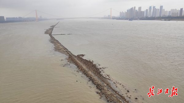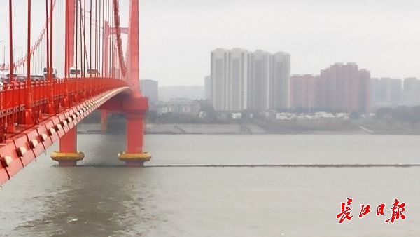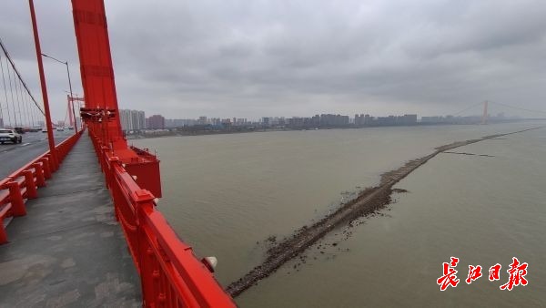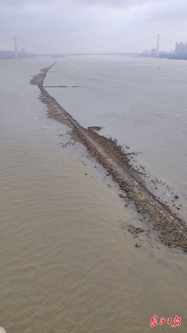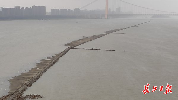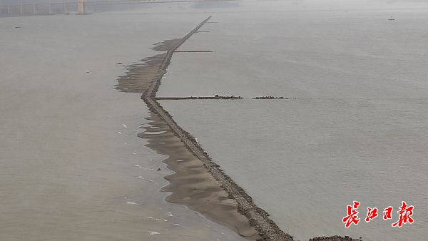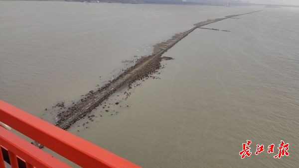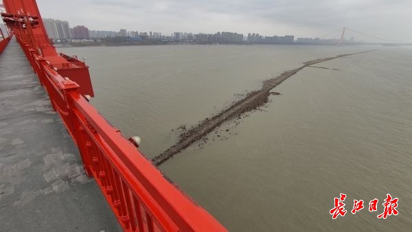 长江网11月25日讯 11月25日,鹦鹉洲长江大桥中间桥墩处,从长江下游往上游方向,江面正中间出现了一条细长“道路”,将长江水道一分为二,绵延2公里左右。据了解,这是航道整治的建筑物——丁字坝。因该处附近江面较宽,为了让江水集中利于行船,丁字坝起到了束水的作用。其作用在于整治航道,优化通航环境。因近期江水退却的原因,该建筑物部分显露在江面上。(记者李子云 摄影报道)