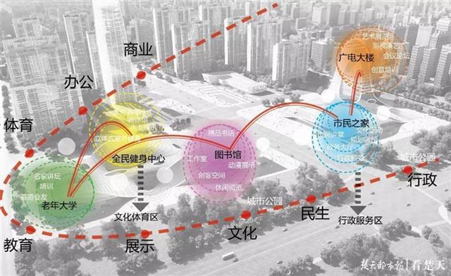 方案为市民之家策划了市民讲堂、规划展示等功能,丰富市民生活;为广电演播大楼策划了会议、培训、演播等功能,引导大众参与;为图书馆策划了动漫展示、创客空间和工作室,引领时尚潮流;为全民健身馆和老年大学策划了立体式的室外健身场所,实现文体互动;五个单体建筑相互独立又互有联系,可独立使用,也可整体运营,实现“行政+民生+文化+展示+体育+教育”多核驱动,共同打造内容多样,业态丰富,面向公众、全天候、可持续发展的24小时活力客厅。