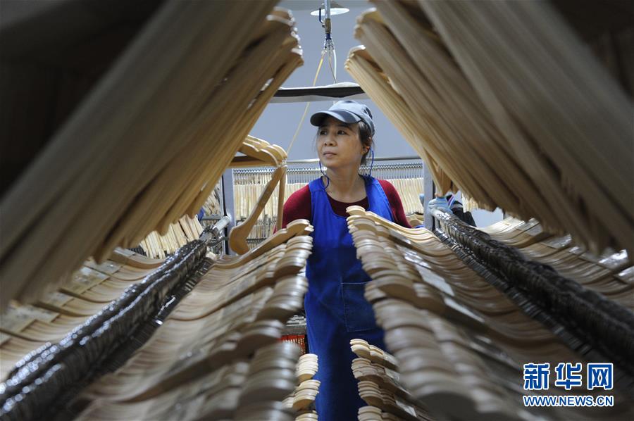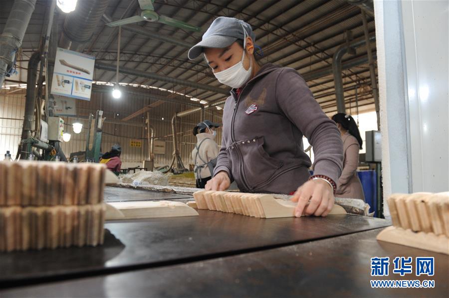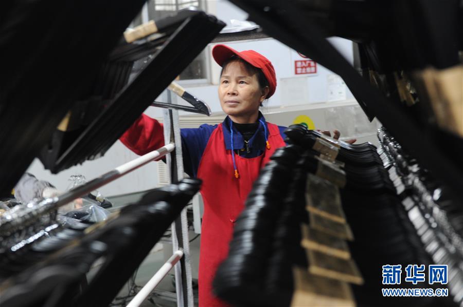 11月27日,在广西荔浦市桂林华海家居用品有限公司的衣架生产扶贫车间,荔浦市蒲芦瑶族乡万福村的贫困户钟永兰在检查衣架半成品,将不合格的产品挑选出来。新华社记者 冯为民 摄