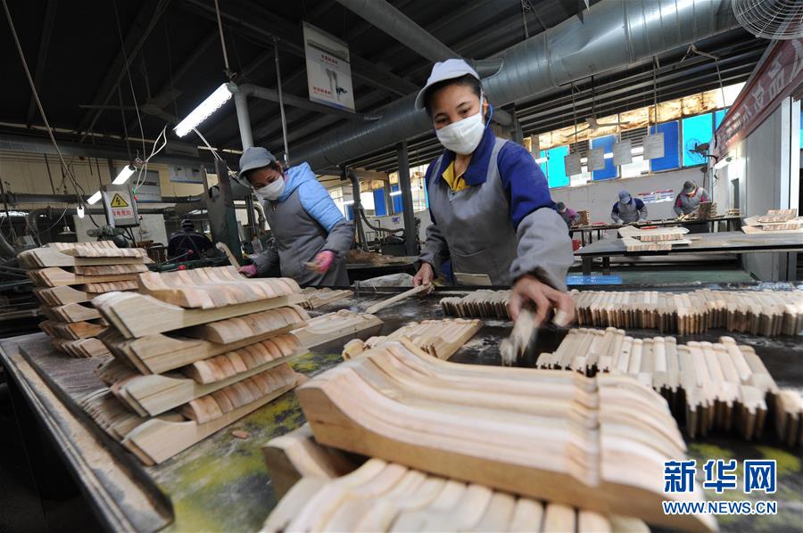 11月27日,在广西荔浦市的一家衣架生产企业喷漆车间里,工人对打磨成型架坯进行喷漆、擦色处理 。新华社记者 冯为民 摄