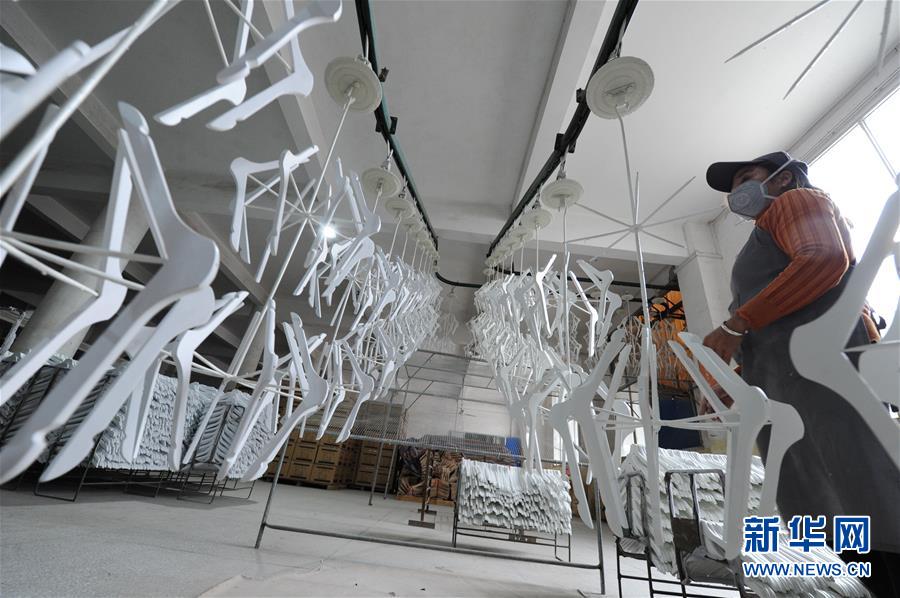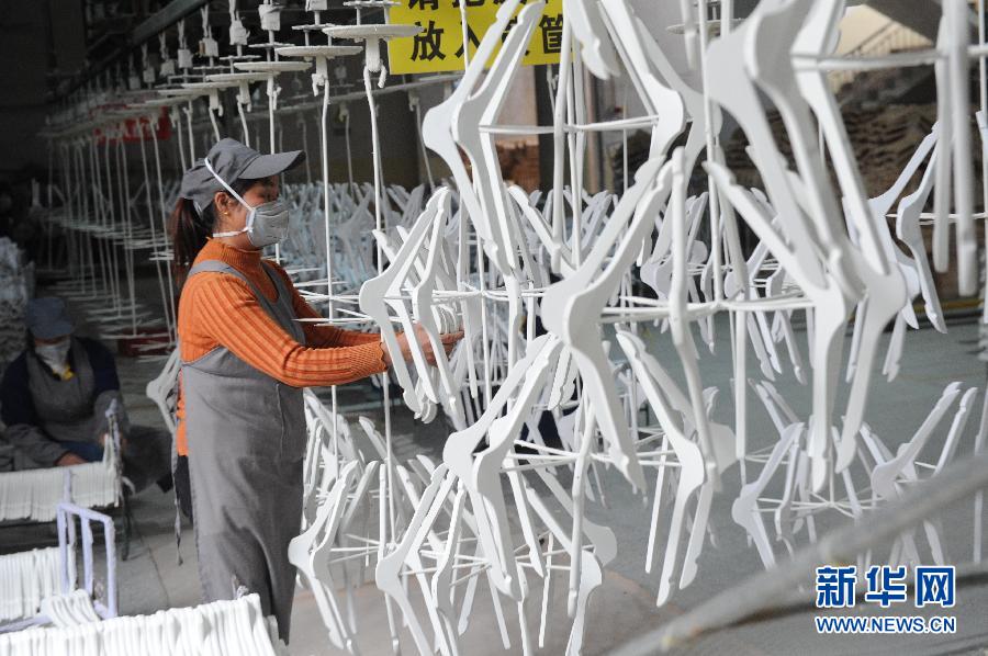 11月27日,在广西荔浦市的一家衣架生产企业,工人在对衣架进行包膜处理。新华社记者 冯为民 摄