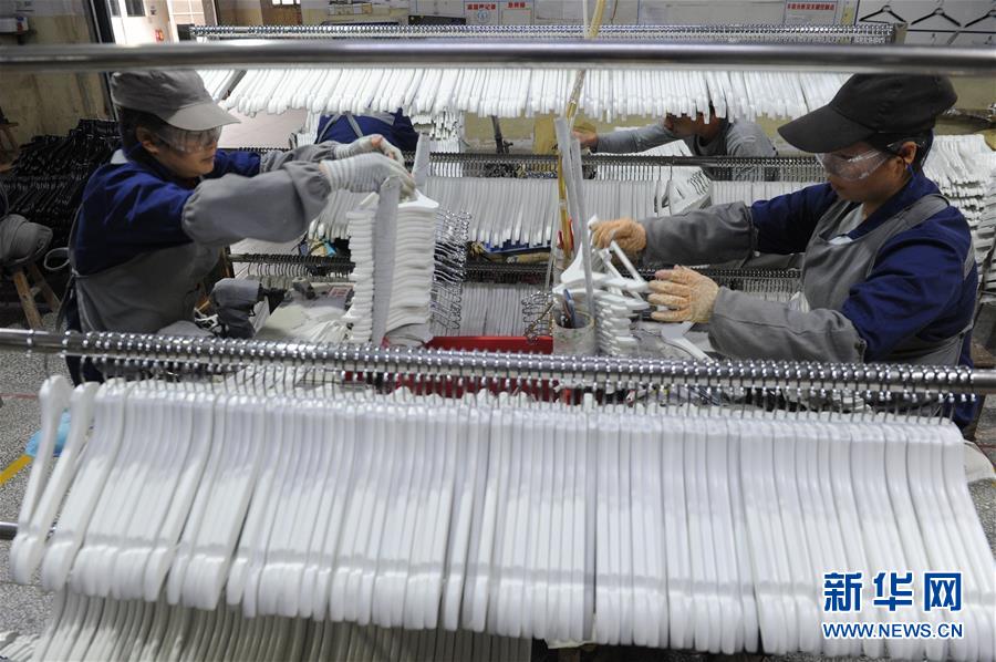11月27日,在广西荔浦市的一家衣架生产企业组装车间里,工人们对衣架进行压钩组装。新华社记者 冯为民 摄