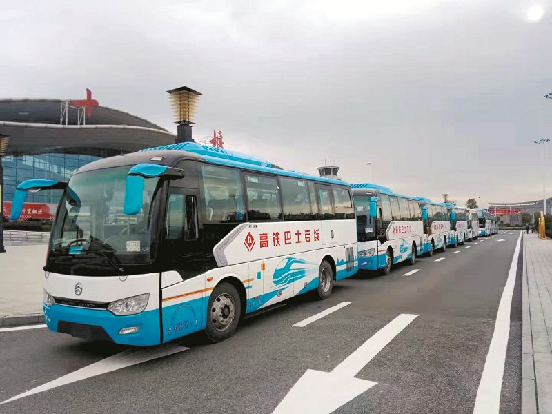 配备8台32座高级豪华大巴,统一标识并按高铁始发和终到时刻,循环发班,自早6:30时至晚23:00时不间断运行。票价10元/人。