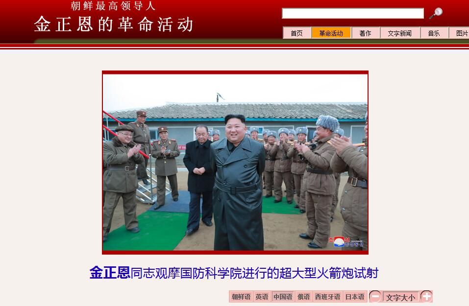 朝中社11月29日消息称,朝鲜劳动党委员长、国务委员会委员长、武装力量最高司令官金正恩观摩了国防科学院进行的超大型火箭炮试射,并对试射结果表示极大满意。