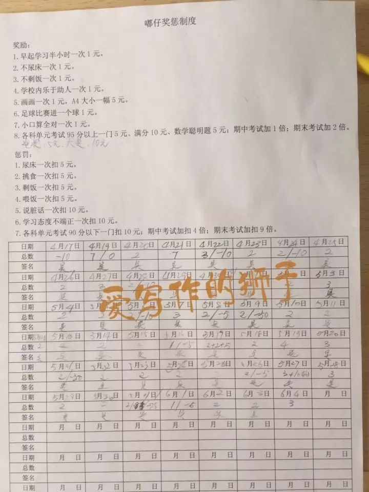 为了提高儿子的积极性,吴先生可以说是软硬兼施。他曾经给儿子做过一个奖惩表,上面详细写着各种奖惩制度,比如早起学习半小时一次奖励1元,各科单元考试95分以上一门奖励5元、满分10元,期中考试加1倍,期末考试加两倍。对应的,学习态度不端正一次扣10元,各科单元考试90分以下一门扣10元;期中考试加扣4倍,期末考试加扣9倍……