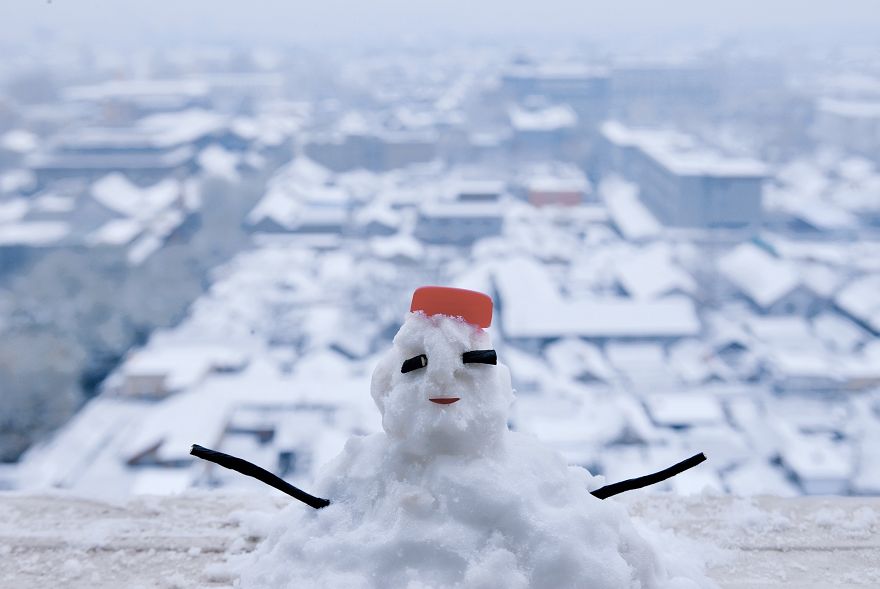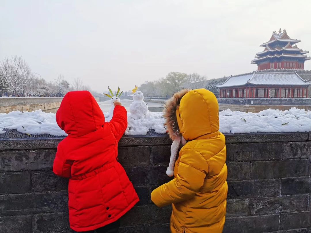 11月30日上午,两名孩子在故宫外堆雪人。(摄影:张传奇)