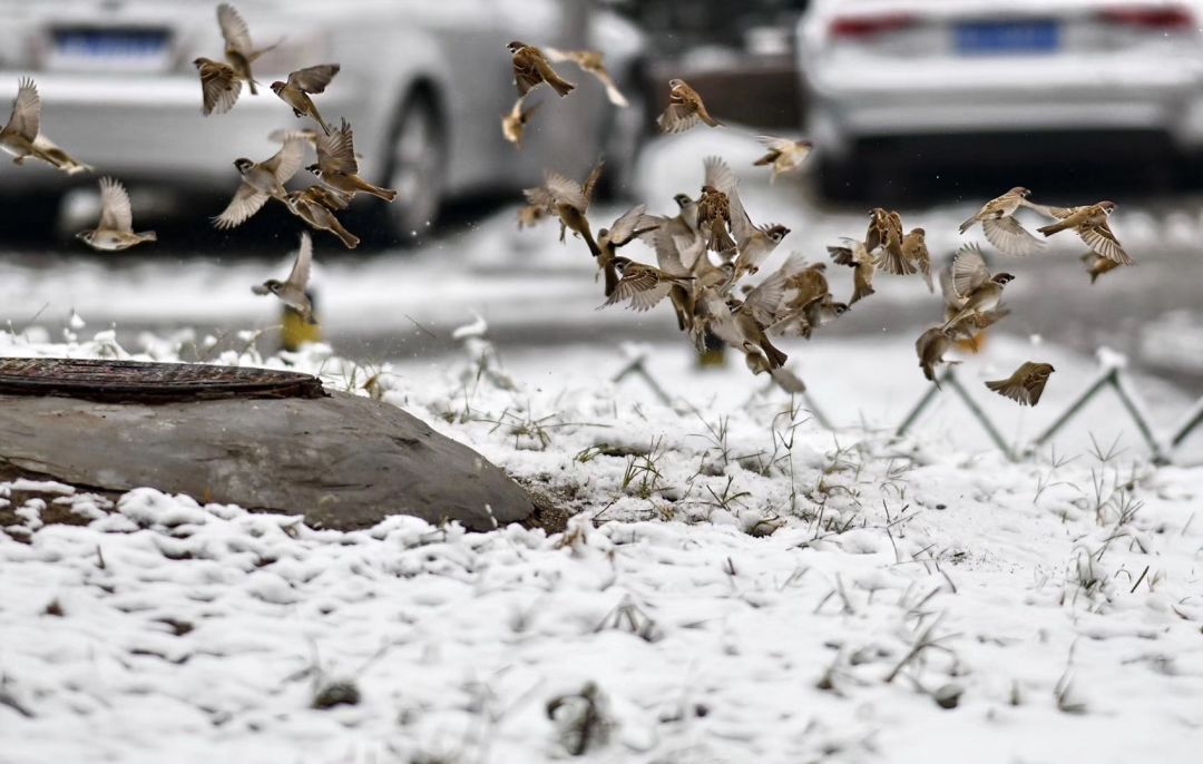 11月30日,北京,麻雀在雪中觅食。 新华社记者 李欣 摄