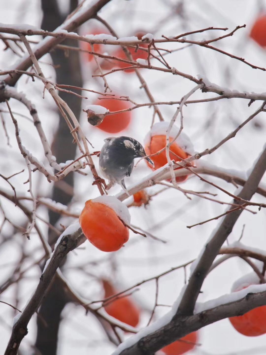 11月30日,雪后北京,一只小鸟停在柿子树上。(摄影:黄敏)