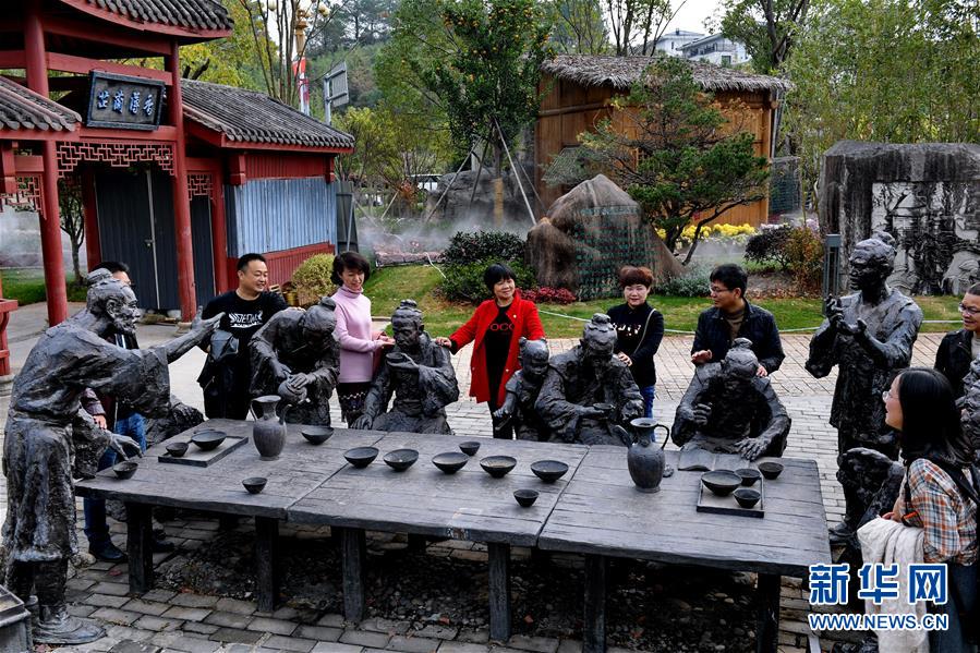 12月1日,游客在武夷山大红袍体验中心参观斗茶雕塑群。 当日,福建武夷山大红袍体验中心开园接待游客。武夷山大红袍体验中心对原中华武夷茶博园进行全面改造提升,打造成集武夷茶文化展示、观赏陈列、互动体验、茶艺交流等于一体的全新文化旅游项目, 是当地市民、外地游客了解武夷山茶文化的综合性园区。 新华社记者 张国俊 摄