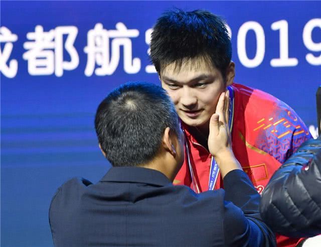 登上最高领奖台后,为他颁发金牌的是中国乒协主席刘国梁。刘国梁拍了拍樊振东的脸说:“特别棒!希望明年还这样! ”