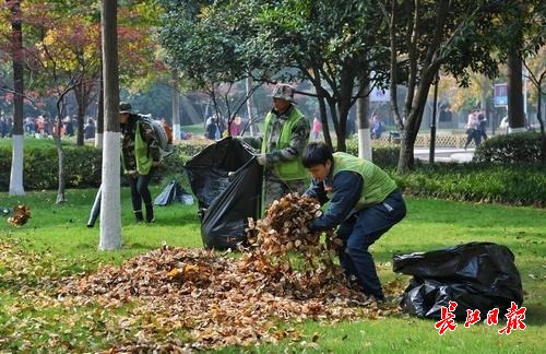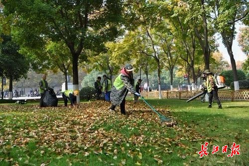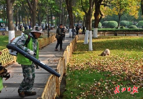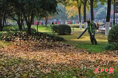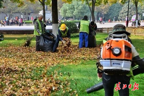 长江网12月2日讯 2日,初冬的汉口中山公园,金黄的枯叶散落于公园草坪。只见园方工作人员身背一个形似大号“电吹风”的落叶清扫机进行作业,树叶随即被窸窣地清理归堆;再由其他人员挥耙舞帚,集中打包处理,连低矮灌木底部的缝隙处也清理干净了。(记者苗剑 通讯员涂靓 摄影报道)