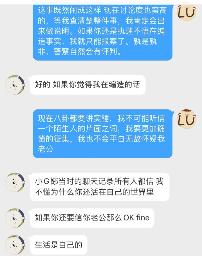 而针对女方的指责,lu一丝坚称自己没有造假,还表示对于老公是否出轨一事会再好好调查。
