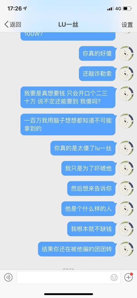 lu一丝还放出她与女方的对峙过程,声称对方此举是为了敲诈勒索自己100万,出轨一事完全是捏造。