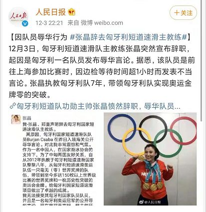 12月3日晚,匈牙利国家短道速滑队主教练张晶突然在社交媒体上宣布:由于匈牙利短道队中有队员发表辱华言论,自己将辞去队伍主教练一职。