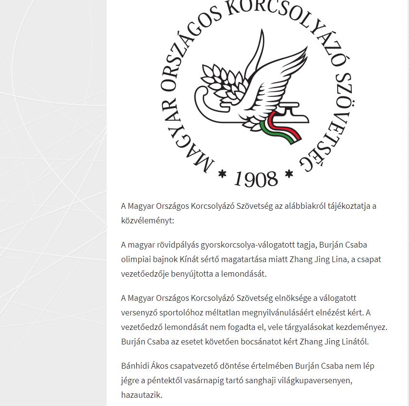 匈牙利国家滑冰协会官方发布公告,表达了对Csaba Burján言论无法容忍的态度,并决定对其进行纪律处罚。而对于张晶的辞职,匈牙利滑冰协会理事会表示并不接受,并将开启与张晶的谈判。