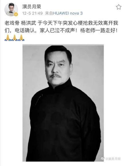网易娱乐12月6日报道 据消息称,12月5日,著名演员、浙江省话剧院一级演员杨洪武因突发心梗去世,仅58岁。其子杨晋12月6日早转发微博确认逝世消息,称“家父走的没有痛苦”。