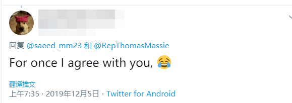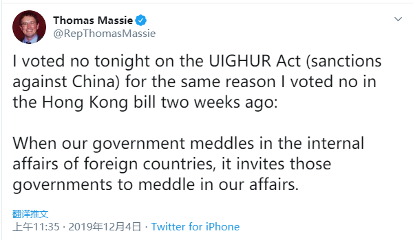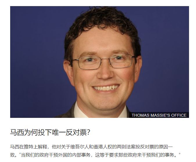 当地时间12月3日,美国国会众议院通过了蓄意诋毁中国新疆人权状况,干涉中国新疆事务的所谓“2019年维吾尔人权政策法案”,来自肯塔基州的共和党众议员马西(Thomas Massie)投下了反对票,之前,他也曾投下“香港人权与民主法案”的反对票。今天,他被英国BBC等多家外媒报道。