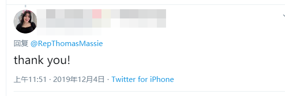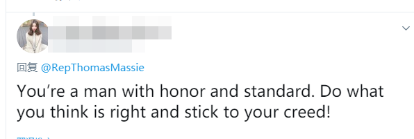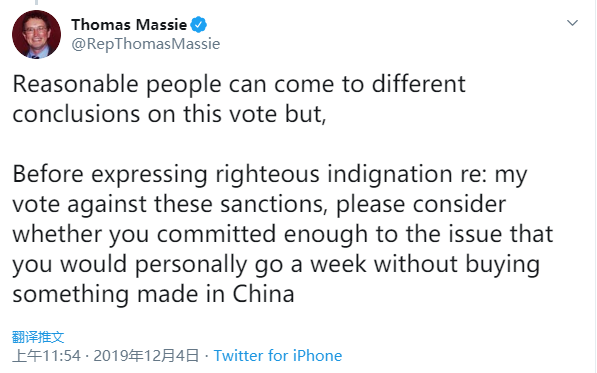 马西还建议,所有质疑他投反对票的人都应该首先自问:是否能有实际行动,比如坚持一个星期拒买任何中国制造的产品。在马西的推特下面,虽然有人对马西的想法表示不理解,但还是有很多人对他支持点赞。