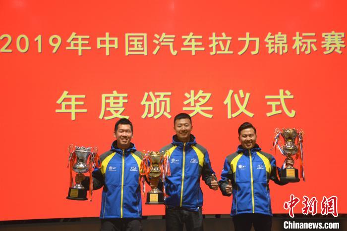 来自斯巴鲁中国魔力拉力车队的车手范高翔(中)蝉联CRC2019年度总冠军。 龚雯 摄
