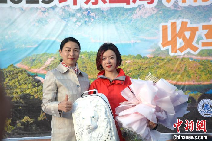 漳州市副市长吴卫红(左)为车手李海颁发特别纪念品。 龚雯 摄