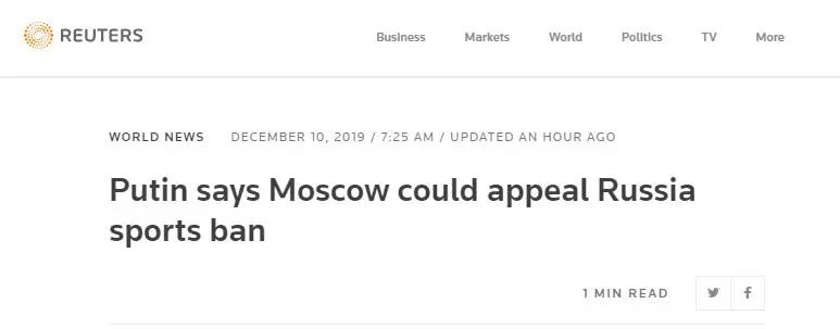 报道称,普京在巴黎举行的“诺曼底模式”四国峰会与乌克兰总统泽连斯基会晤后回应了此事。普京说,俄罗斯将分析WADA的决定。他批评说,这个决定是出于政治目的,不符合体育的利益,“我们有充分理由提起上诉。”9日,WADA执行委员会在瑞士洛桑举行会议,一致通过“对俄罗斯禁赛4年”的提议。上个月25日,世界反兴奋剂机构独立合规审查委员会以“莫斯科反兴奋剂实验室数据造假”为由,发起这一提议。