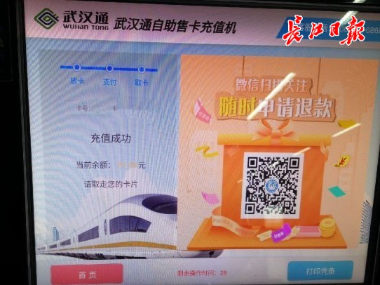 长江网12月10日讯(记者龚萍)近日,市民严先生致电本报热线,称在武汉地铁站内自助充值机上充值时,被强制关注公众号。武汉通公司相关人士表示,用户使用自助充值设备时,如果不想关注公众号,可以点击屏幕右下方的“残忍拒绝,直接支付”的选项,即可直接完成充值。