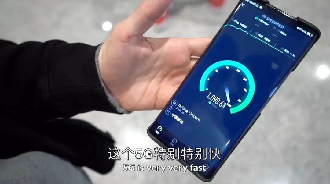 他拿出手机,打开测速程序。“我们开始。哇,900,900快到1000……喔吼,我给你们说,我在电脑上从来没看到这么快的速度,网的速度。这个5G特别特别快。”