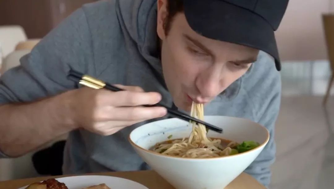 ▲沉迷“嗦面”的郭杰瑞(视频截图)