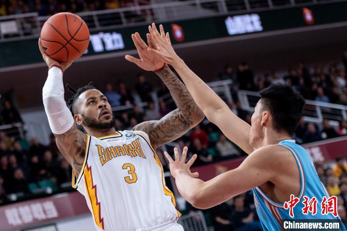 山西汾酒股份队球员莫兰德(白)在比赛中投篮。 韦亮 摄